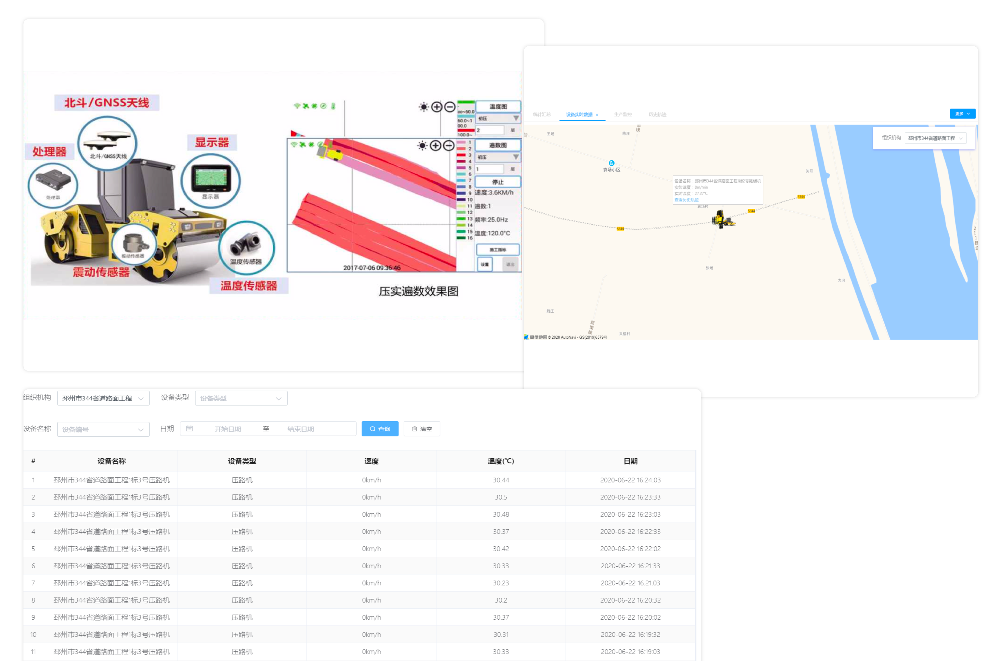 采用智能傳感設(shè)備對(duì)前場(chǎng)施工設(shè)備進(jìn)行全過(guò)程跟蹤,實(shí)時(shí)監(jiān)控碾壓和攤鋪設(shè)備的位置、軌跡、速度、溫度、遍數(shù)等,實(shí)現(xiàn)前場(chǎng)
